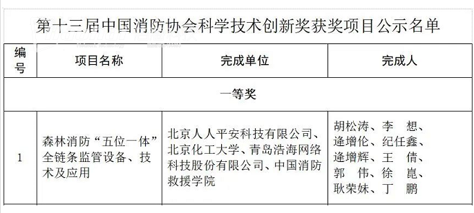 近日,中國消防協(xié)會在京組織召開了“第十三屆中國消防協(xié)會科學技術創(chuàng)新獎”評審會。由青島浩海網絡科技股份有限公司參與完成的《森林消防“五位一體”全鏈條監(jiān)管設備、技術及應用》科研項目榮獲第十三屆中國消防協(xié)會科學技術創(chuàng)新獎一等獎。